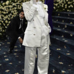 Domingo, in Valentino, arrived with Vogue’s Wintour, dressed in a pastel blue coat over a shimmery white gown by Louis Vuitton, a gala sponsor. Fellow co-chair Lewis Hamilton donned a jaunty ivory tuxedo with a cropped jacket, a matching beret and cowrie shell embellishment.