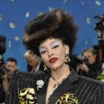 Colman Domingo, one of the evening’s hosts, wore a pleated, gold adorned cape over a gray and black suit, his jacket a pearled windowpane design with a huge dotted black flower. His look, including his cape and a dotted black scarf at his neck, evoked the late André Leon Talley, the fashion icon who made history as a rare Black editor at Vogue.