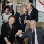 Sally Struthers plants a kiss on the cheek of Rob Reiner (right), as Carroll O’Connor and Jean Stapleton hold hands Feb. 12, 1991, during a reunion of the cast of “All in the Family,” at the O’Conner restaurant in Beverly Hill, Calif. (AP)