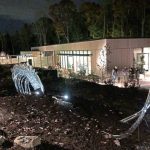 There is a woolly mammoth nearly life-sized glass skeleton located outside the garden.
