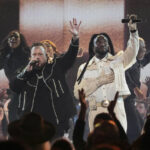 Zach Top stripped things down for “Use Me.” Blake Shelton channeled the great George Strait for his new single “Texas,” followed by Wilson with “Whirlwind.” Kelsea Ballerini performed atop her “Baggage.” Johnson rocked “The Fall,” before performing “Red Dirt Road” with Brooks & Dunn. Chris Stapleton and his wife, Morgane, harmonized on “It Takes a Woman.”