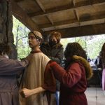 Kibler was steaming Joseph’s garments. A few of the statues needed repairs from a broken shoulder to a hip out of its socket. Volunteers work off of photographs to make sure the outfits are on properly. They usually dress the figurines in the Pittsburgh Civic Light Opera’s warehouse, but had to do it outside because of the pandemic. There are several costumes for each statue and what they wear change over the years.