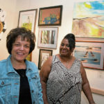 Exhibiting artists Fran DiVecchio (left) of Mt. Pleasant (work shown bottom center) and Pamela Cooper of Greensburg