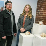 Steve Zanavich of Greensburg joins exhibiting artist Samantha Lantz of Greensburg (work shown right) for a photo during the March 9 opening reception of “Disconnections,” held at the You Are Here Gallery in Jeannette.