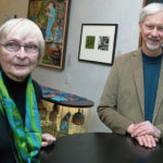 Collaboration artists Gudrun Garkisch (left) of Irwin and Richard Stoner of Unity (work shown back) pose for a photo during the opening reception for “Collaborations”on Feb. 1 at the Greensburg Art Center.