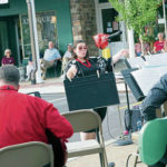 Members of the Ligonier Valley High School concert and jazz bands and percussion ensemble set up in front of Ligonier Town Hall, as concert-goers parked their chairs in the street (closed to traffic for the duration) and on the grassy expanse of the recently refurbished Diamond.