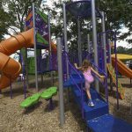 Bailey Tomasino, 4, plays on a playground slide at Miners Memorial Park during the 100th-anniversary celebration of Coverdale.