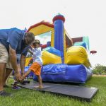 Samuel Richardson, 50, removes his son Maximus’ shoes before entering the bouncy house during the 100th-anniversary celebration of Coverdale in Bethel Park on July 17. Richardson, the youngest of seven siblings, said he members playing in Miners Memorial Park as a child.