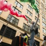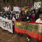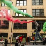 A demonstrator ignites colored smoke in support of Palestine during a peace march in Downtown Pittsburgh on Saturday, March 2, 2024 to demand a ceasefire in the war in Gaza, and that Israel stop military operations in Rafah, the southern part of Gaza. The march for peace in Gaza drew a crowd of hundreds and was organized by Students for Justice in Palestine, and Jewish Voice For Peace.