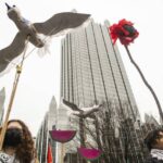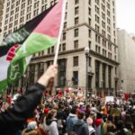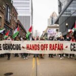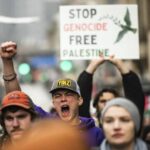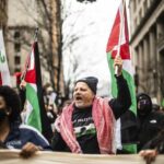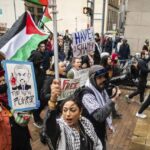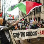 Saturday’s protest was one of many staged simultaneously around the world, according to an event coalition that includes the Palestinian Youth Movement, the International Peoples’ Assembly and numerous other organizations.