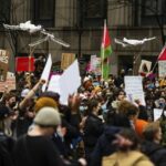 Demonstrators gather in Downtown Pittsburgh on Saturday, March 2, 2024 to demand a ceasefire in the war in Gaza, and that Israel stop military operations in Rafah, the southern part of Gaza. The march for peace in Gaza drew a crowd of hundreds and was organized by Students for Justice in Palestine, and Jewish Voice For Peace.