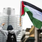 A demonstrator waving a Palestinian flag shows the peace sign in Downtown Pittsburgh on Saturday, March 2, 2024 during a “Hands off Rafah” peace march. The march for peace in Gaza drew a crowd of hundreds of protesters, and was organized by Students for Justice in Palestine, and Jewish Voice For Peace.