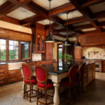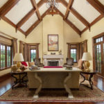 The living room is a showpiece, with a vaulted exposed beam ceiling, stone fireplace and French doors that open to an outdoor patio.