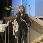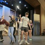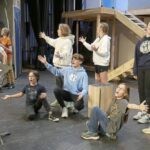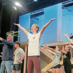 Ayden Fichte (from left), Kyle Schuetz, Oden Rebarchak, Greyson Peters, Owen Meals, Jack Flanick, Juliette Brun, Sawyer Peters, Chiara Brun and Carter Loughren rehearse a scene from Riverview High School’s upcoming spring musical “Joseph and the Amazing Technicolor Dreamcoat.”
