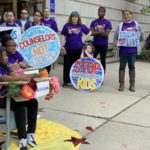 The group of activists, teachers, parents with young children and legal advocates held signs such as “Counseling not cops,” “Solutions, not suspensions,” and “Stop criminalizing kids.”