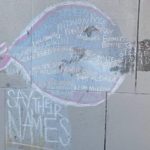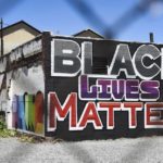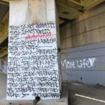 “BLACK LIVES MATTER” is written in giant white block letters that are outlined in red on the retaining wall adjacent to the Three Rivers Heritage Trail.