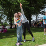 LGBTQ+ couple Jen Orr, right, and Harrah Rosalyn look at a beer promotion sign in the sky during Pittsburgh Pride Parade on Saturday, June 1, 2024.