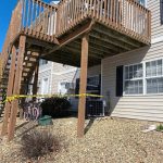 It appeared two units were affected by the collapse. Windows were broken, and the area underneath a wooden deck was blocked by yellow tape. Blood stained the sidewalk and road, and a couple shoes lay without their mates.
