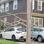 Fallen tree branch damages power lines, vehicles