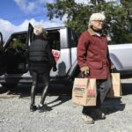 Volunteers from the Chevy Chase Community Center, Paula Good (left), Jenny Rairigh and Betty Hovland, give bags of food to residents Lucinda Stiffler (front right) and Mary Kay McGaughey from the back of a truck in a nearby parking lot Monday, in White Township, Indiana County. Volunteers were determined to keep the center’s food distribution program running despite the building being closed following a fatal shooting there over the weekend.