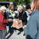 Nearby residents Lucinda Stiffler (left) and Mary Kay McGaughey talk to volunteers as they pick up bags of food from the Chevy Chase Community Center’s meal distribution program Monday, in White Township, Indiana County. Volunteers were determined to keep the center’s food distribution program running despite the building being closed following a fatal shooting there over the weekend. They will be set up for the next several days in a nearby parking lot.