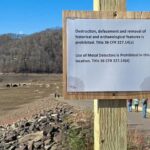 Despite another posted sign prohibiting the activity, at least one visitor was seen using a metal detector to explore the exposed lake bed. The site had been occupied by the small town of Somerfield before it was inundated in 1943 by the construction of a dam and the creation of the lake — part of a federal flood control program.