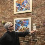 Sewickley Exposure owner Ann Fernandez marvels at the latest creation by Pittsburgh artist Elizabeth Lana called “Slava Ukraini.”