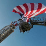 An American flag was suspended 30 feet between ladder trucks from New Kensington and Arnold volunteer fire departments at the American Legion Post 868 in Lower Burrell for a Sept. 11 ceremony Wednesday observing the 18th anniversary of the terror attacks.