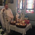 The service paid homage to the high holiday in all of its pageantry. The Rev. Mark Swindle dressed in crisp, ivory robes, a spray of white Easter lilies and hyacinths adorned the altar, holiday banners bedecked the altar, and candles lit Easter baskets waiting to be blessed.