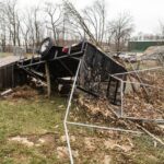 A demolished garage that suffered damage Sunday from a tornado is seen at the home of Melinda Urbanic along Route 31.