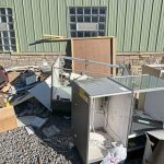 Large piles of damaged contents, littered with shattered glass, remained outside the business Wednesday.