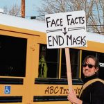 Some protesters held homemade signs that included messages such as “The Sky Is Not Falling,” “End The Mask Mandate,” and “Face Facts, End Masks,” “No Masks For Kids,” and “Unmask My Child.”