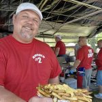 Chris O’Leath was busy with fellow Arnold Volunteer Engine Company No. 2 volunteers manning their french fry booth Sunday. The company depends on sales of their “famous fries” with various toppings such as gravy and cheese, for much-needed revenue.