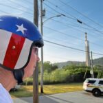 Cheswick native Russell Gruchalak, 68, dons his motorcycle helmet to watch the smokestack implosion Friday morning along Dusquesne Avenue. Cheswick native Russell Gruchalak, 68, dons his motorcycle helmet to watch the smokestack implosion Friday morning along Dusquesne Avenue.