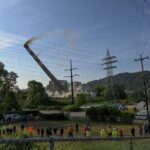Continued clean up work on Pittsburgh Street from Cheswick, where earlier in the day two smokestacks from the Cheswick Generating Station were imploded. A few power lines are still down. The road remains blocked off. Continued clean up work on Pittsburgh Street from Cheswick, where earlier in the day two smokestacks from the Cheswick Generating Station were imploded. A few power lines are still down. The road remains blocked off.