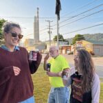 Family members Sereny Welsby (left), Mark Welsby and Casey Welsby gather over coffee Friday morning along Pittsburgh Street for an implosion watch party at Casey’s home.