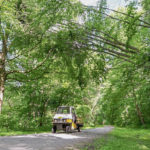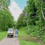 Tom Iseman, vice president of Roaring Run Watershed Association, drives under a downed tree while inspecting the trail on Tuesday, June 25, 2019.