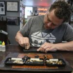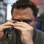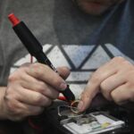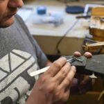 Brian Nicklaus, owner of Brian Nicklaus Jewelry inside The Pawn and Jewelry Exchange in Greensburg, works on a custom pendant using 14k white gold and a tsavorite garnet recycled from other pieces inside the shop Tuesday.