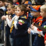 Scouts gathered in front to watch each car careen down the metal track, cheering as they sped down the three-laned track.