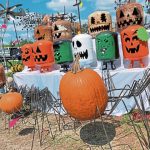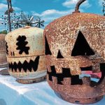 Jack-o’-lanterns made from old propane tanks were created by Stan Moye, owner of Virginia-based Stan’s Yard Art, seen here at the Pennsylvania Arts & Crafts Labor Day Festival in Mt. Pleasant Township on Friday.