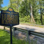 A yellow and blue marker erected by the Pennsylvania Historical and Museum Commission and adjacent monument owned by Westmoreland County have for decades marked a spot near where Arthur St. Clair, an officer in the Revolutionary War, lived out his final days. The state marker was put up along the eastbound lanes in December 1946.