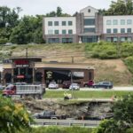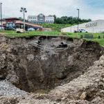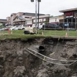 Fencing and orange cones blocked off the gigantic hole on a hillside along the highway next to Towne Square and Greensburg Commerce Park, which houses Gander Outdoors and Dino’s. The hole is on private property, said Valerie Petersen, PennDOT District 12 spokeswoman.