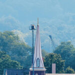 Greensburg Diocese Bishop Larry Kulick is lifted 110 ft to bless the steeple of St.Mary Mother of God church in Freeport on Sunday morning along with Pastor Rick Kosislko. The blessing is part of the forty-hour Eucharistic Devotion. Sunday.