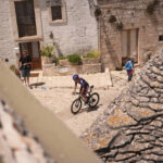 A cyclist pedals amongst typical trulli, a traditional dry-stone hut in the region of Puglia, before the start of the fourth stage of the Giro d’Italia cycling race, from Alberobello to Lecce, southern Italy, Tuesday.