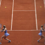 Slovakia’s Rebecca Sramkova is reflected in a glass as she plays Poland’s Iga Swiatek during their first round match of the French Tennis Open, at the Roland-Garros stadium, in Paris, Monday.