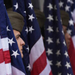 U.S. Army soldiers stand with U.S. flags before President Donald Trump arrives to deliver the Memorial Day Address at the 157th National Memorial Day Observance at Arlington National Cemetery, Monday, in Arlington, Va.