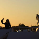 Democratic presidential nominee Vice President Kamala Harris boards Air Force Two at Oakland County International Airport in Waterford Township, Mich., Monday, en route to Milwaukee.