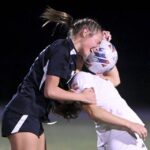 Pine-Richland’s Lily Rosenwasser battles Latrobe’s Robin Reilly for a header during their WPIAL Class 4A first round playoff game on Monday, in Pine.