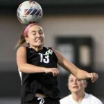 Pine-Richland’s Riley White heads the ball against Latrobe during their WPIAL Class 4A first round playoff game on Monday, in Pine.