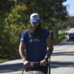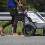 Anton Nootenboom, a veteran from Amsterdam, walks along Beatty County Road in Unity on Thursday, Oct. 3, 2024. Nootenboom is on the last leg of his barefoot cross country trek from Los Angeles to New York City to raise awareness and money for men’s mental health organizations.